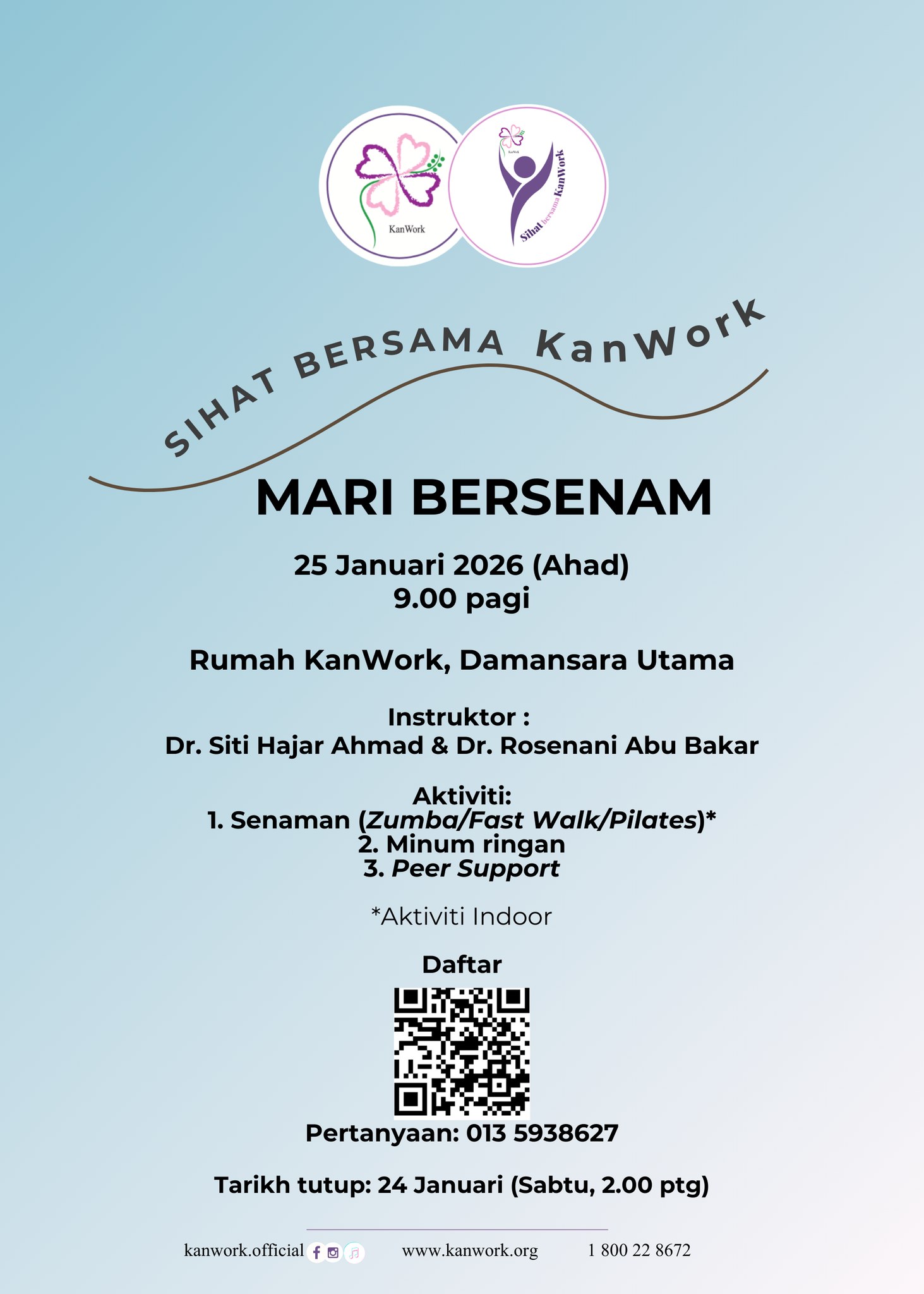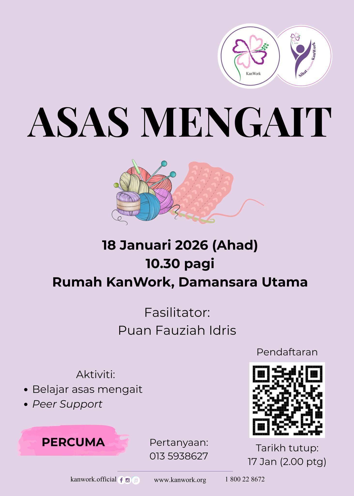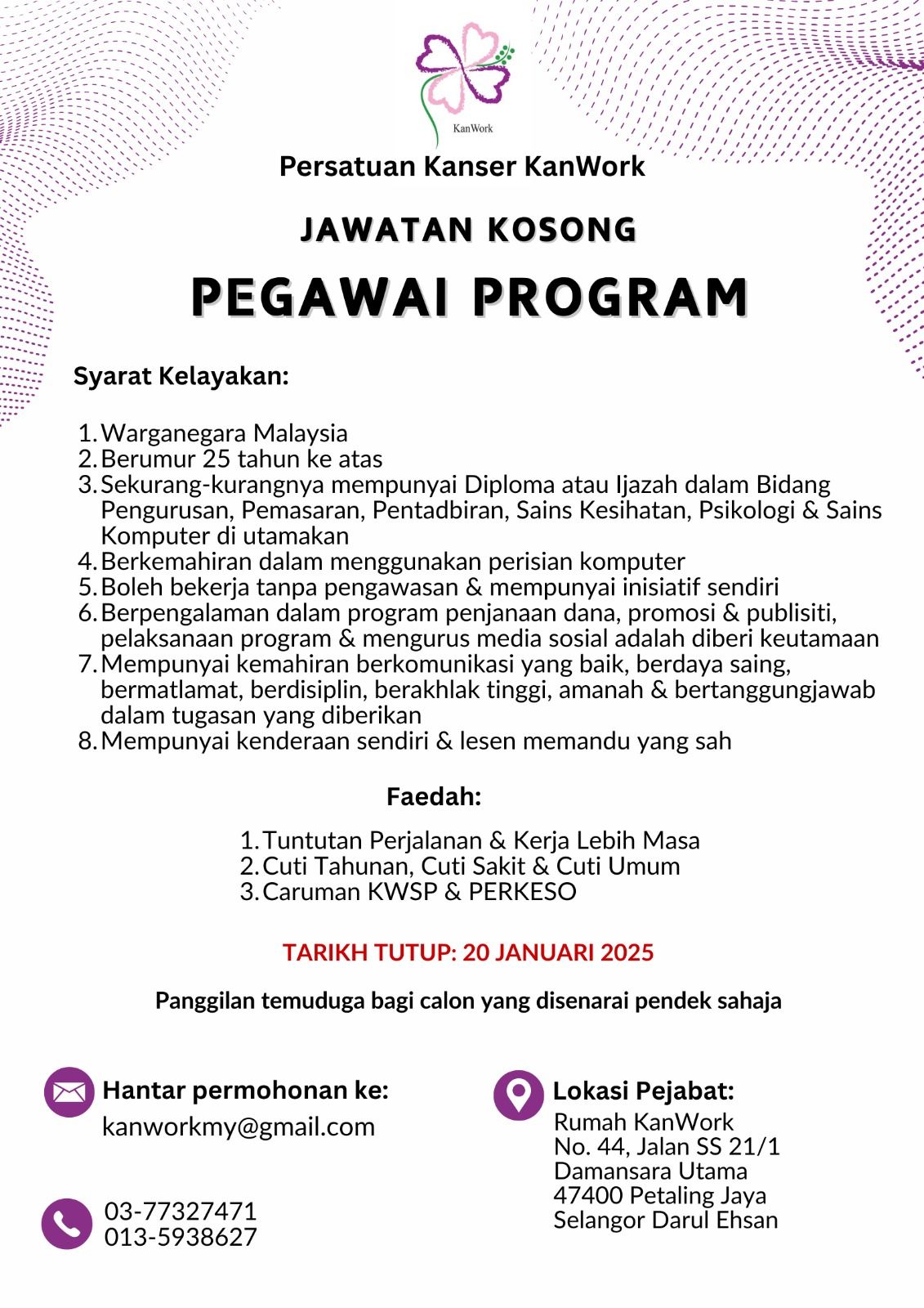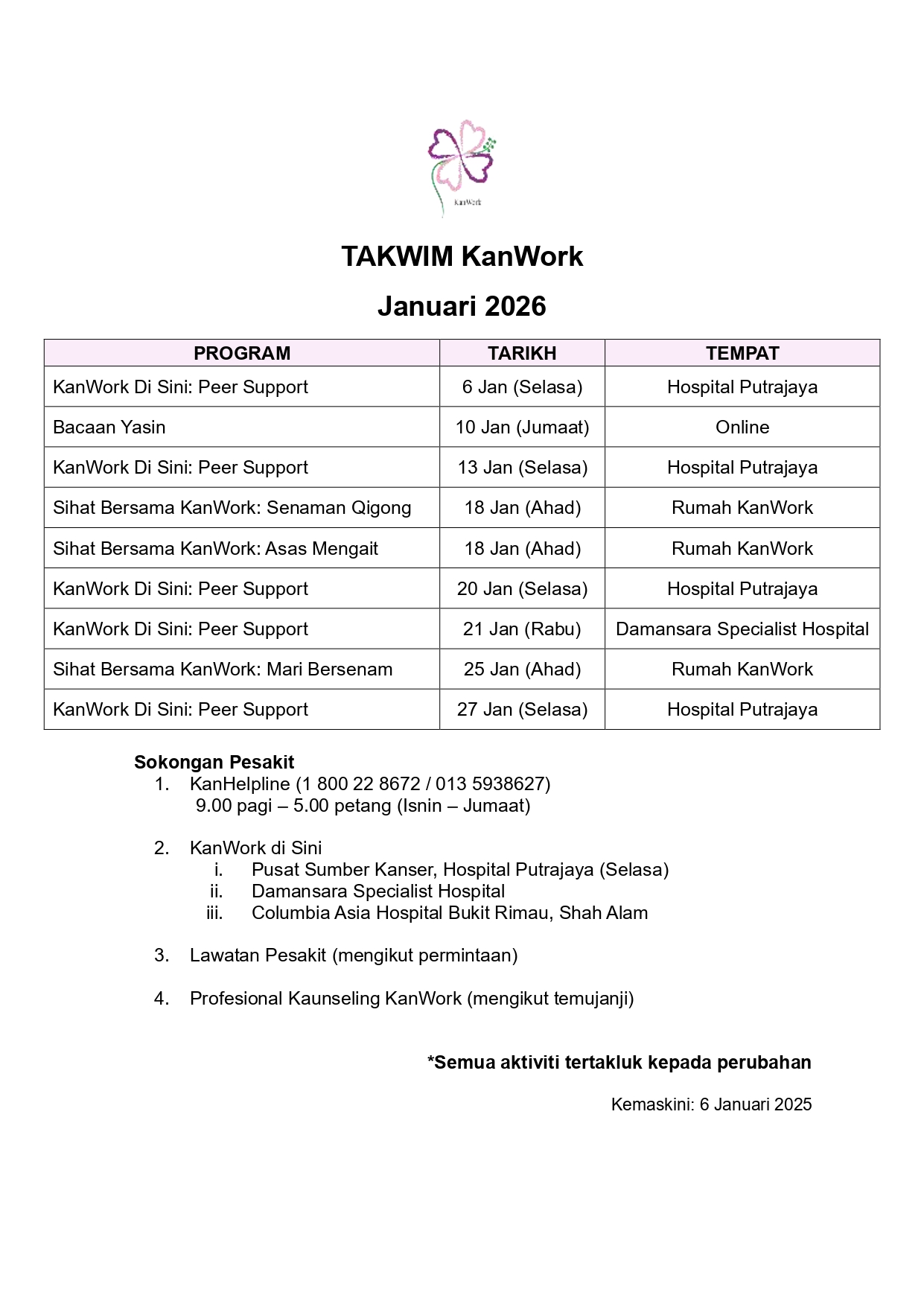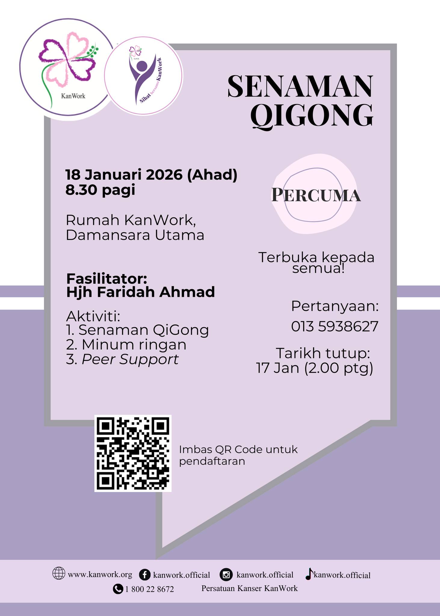 BERITA SIHAT BERSAMA KANWORK – MARI BERSENAM – 26/01/2026 Baca Selanjutnya → Lawatan Ladang Buah Tin 23/01/2026 Baca Selanjutnya → HEBAHAN SIHAT BERSAMA KANWORK – MARI BERSENAM – 22/01/2026 Baca Selanjutnya → SENAMAN QIGONG 20/01/2026 Baca Selanjutnya → ASAS MENGAIT 20/01/2026 Baca Selanjutnya → Apresiasi rakan sokongan & sukarelawan KanWork 12/01/2026 Baca Selanjutnya → HEBAHAN – SENAMAN QIGONG – 12/01/2026 Baca Selanjutnya → HEBAHAN ASAS MENGAIT 12/01/2026 Baca Selanjutnya → JAWATAN KOSONG 09/01/2026 Baca Selanjutnya → Majlis Bacaan Yasin 09/01/2026 Baca Selanjutnya → Takwim KanWork (Januari 2026) 06/01/2026 Baca Selanjutnya → KanWork Di Sini @Hospital Putrajaya PEER SUPPORT 05/01/2026 Baca Selanjutnya → KanWork di Sini @Hospital Putrajaya 30/12/2025 Baca Selanjutnya → KanWork Di Sini @Hospital Putrajaya PEER SUPPORT 26/12/2025 Baca Selanjutnya → Seminar Kebangsaan Pertanian Organik (SKOr) 2025 25/12/2025 Baca Selanjutnya → KanWork di Sini @Damansara Specialist Hospital 24/12/2025 Baca Selanjutnya → Kaunseling KanWork 24/12/2025 Baca Selanjutnya → SUMBANGAN AKHIR TAHUN 2025 23/12/2025 Baca Selanjutnya → Keseimbangan Dan Kesejahteraan Penjaga 22/12/2025 Baca Selanjutnya → KANWORK DI SINI @KPJ DAMANSARA SPECIALIST HOSPITAL – PEER SUPPORT – 20/12/2025 Baca Selanjutnya → KanWork Di Sini @Hospital Putrajaya PEER SUPPORT 19/12/2025 Baca Selanjutnya → Perbincangan Pengurusan Kewangan KanWork 18/12/2025 Baca Selanjutnya → Pembangunan Organisasi KanWork 2025 16/12/2025 Baca Selanjutnya → Naib Canselor Universiti Putra Malaysia & Penasihat KanWork 15/12/2025 Baca Selanjutnya → HARI KEPUTERAAN SULTAN SELANGOR 11/12/2025 Baca Selanjutnya → KanWork Di Sini @Hospital Putrajaya PEER SUPPORT 10/12/2025 Baca Selanjutnya → SIHAT BERSAMA KANWORK – MARI BERSENAM – 08/12/2025 Baca Selanjutnya → KESEIMBANGAN DAN KESEJAHTERAAN PENJAGA 05/12/2025 Baca Selanjutnya → KanWork Di Sini @Hospital Putrajaya PEER SUPPORT 05/12/2025 Baca Selanjutnya → HEBAHAN SIHAT BERSAMA KANWORK – MARI BERSENAM 04/12/2025 Baca Selanjutnya → Takwim KanWork (Disember 2025) 03/12/2025 Baca Selanjutnya → KanWork di Sini @Hospital Putrajaya 02/12/2025 Baca Selanjutnya → Pembangunan Sukarelawan Sokongan Pesakit KanWork 01/12/2025 Baca Selanjutnya → KanWork Di Sini @Hospital Putrajaya PEER SUPPORT 01/12/2025 Baca Selanjutnya → ASAS MENGAIT 30/11/2025 Baca Selanjutnya → SENAMAN QIGONG 30/11/2025 Baca Selanjutnya → Merai Langkah, Menyemai Harapan: KanWork Ke-20 Tahun 28/11/2025 Baca Selanjutnya → TELAAH 27/11/2025 Baca Selanjutnya → Official launching of Hospital Picaso 26/11/2025 Baca Selanjutnya → HEBAHAN ASAS MENGAIT 25/11/2025 Baca Selanjutnya → HEBAHAN – SENAMAN QIGONG – 24/11/2025 Baca Selanjutnya → KANWORK DI SINI @KPJ DAMANSARA SPECIALIST HOSPITAL – PEER SUPPORT – 21/11/2025 Baca Selanjutnya → KanWork Di Sini @Hospital Putrajaya PEER SUPPORT 21/11/2025 Baca Selanjutnya → PENGHARGAAN SUKARELAWAN AKTIF 20/11/2025 Baca Selanjutnya → Takwim KanWork (November 2025) 17/11/2025 Baca Selanjutnya → KanWork Charity Hi Tea 2025 10/11/2025 Baca Selanjutnya → Courage & Care Cancer Awareness Hi Tea 05/11/2025 Baca Selanjutnya → KanWork Di Sini @Hospital Putrajaya PEER SUPPORT 27/10/2025 Baca Selanjutnya → PERKONGSIAN PENGALAMAN BERSAMA SURVIVOR 26/10/2025 Baca Selanjutnya → PUTRAJAYA PINK OCTOBER RUN 26/10/2025 Baca Selanjutnya → Ahli KanWork – Survivor Kanser Payudara 25/10/2025 Baca Selanjutnya → PINK OCTOBER 25/10/2025 Baca Selanjutnya → BREAST CANCER AWARENESS 25/10/2025 Baca Selanjutnya → KanWork mengadakan kunjung hormat ke Persatuan Alumni UPM (PAUPM) 22/10/2025 Baca Selanjutnya → PEER SUPPORT – KanWork Di Sini @Hospital Putrajaya 21/10/2025 Baca Selanjutnya → BERJALAN & BERKELAH KANWORK 14/10/2025 Baca Selanjutnya → BREAST CANCER AWARENESS FORUM (CHANGE HER COURSE) 14/10/2025 Baca Selanjutnya → KanWork Di Sini @Columbia Asia Hospital Bukit Rimau Shah Alam 14/10/2025 Baca Selanjutnya → PEER SUPPORT – KanWork Di Sini @Columbia Asia Hospital Bukit Rimau, Shah Alam 13/10/2025 Baca Selanjutnya → PEER SUPPORT – KANWORK DI SINI @ HOSPITAL PUTRAJAYA 13/10/2025 Baca Selanjutnya → LIGHT UP LIVES’ 11/10/2025 Baca Selanjutnya → KanWork mengadakan kunjung hormat ke Pusat Pengurusan Wakaf, Zakat & Infak (WAZAN) 09/10/2025 Baca Selanjutnya → PROGRAM PENDIDIKAN ‘PENGURUSAN KANSER’ 06/10/2025 Baca Selanjutnya → 2025 PINK OCTOBER CAMPAIGN 06/10/2025 Baca Selanjutnya → HEBAHAN BERJALAN & BERKELAH KanWork 06/10/2025 Baca Selanjutnya → PEER SUPPORT 06/10/2025 Baca Selanjutnya → KanWork DI SINI | DAMANSARA SPECIALIST HOSPITAL 06/10/2025 Baca Selanjutnya → PINK OCTOBER 06/10/2025 Baca Selanjutnya → 2025 PINK OKTOBER CAMPAIGN 01/10/2025 Baca Selanjutnya → Takwim KanWork (Oktober 2025) 30/09/2025 Baca Selanjutnya → MARI MEMASAK 28/09/2025 Baca Selanjutnya → SENAMAN QIGONG 28/09/2025 Baca Selanjutnya → KANWORK DI SINI @ HOSPITAL PUTRAJAYA 28/09/2025 Baca Selanjutnya → PENGURUSAN KANSER 25/09/2025 Baca Selanjutnya → HEBAHAN – SENAMAN QIGONG 22/09/2025 Baca Selanjutnya → KANWORK DI SINI @ HOSPITAL PUTRAJAYA 22/09/2025 Baca Selanjutnya → ASAS MENGAIT 21/09/2025 Baca Selanjutnya → MARI BERSENAM 21/09/2025 Baca Selanjutnya → BERJALAN & BERKELAH KANWORK (TAMAN BOTANI PUTRAJAYA) 20/09/2025 Baca Selanjutnya → PROGRAM SOKONGAN PESAKIT (KANWORK DI SINI) 18/09/2025 Baca Selanjutnya → KANWORK DI SINI @KPJ DAMANSARA SPECIALIST HOSPITAL 18/09/2025 Baca Selanjutnya → PROGRAM SOKONGAN PESAKIT (KANWORK DI SINI) 17/09/2025 Baca Selanjutnya → SIHAT BERSAMA KANWORK : BELAJAR ASAS MENGAIT 17/09/2025 Baca Selanjutnya → SELAMAT HARI MALAYSIA 16/09/2025 Baca Selanjutnya → HEBAHAN – BERJALAN & BERKELAH KanWork 15/09/2025 Baca Selanjutnya → KANWORK DI SINI @KPJ DAMANSARA SPECIALIST HOSPITAL – PEER SUPPORT 15/09/2025 Baca Selanjutnya → DIALOG BELANJAWAN 2026 KEMENTERIAN KES