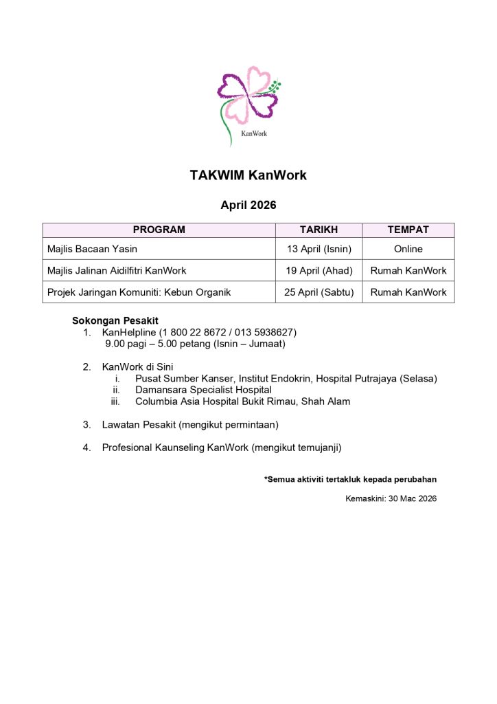 KanWork Di Sini @Hospital PutrajayaPEER SUPPORTSatu sesi perkongsian pengalaman bersama survivor kanser seperti berikut: 14 April 2026(Selasa) 10.00 pagi -12.00 tengah hari Pusat Sumber Kanser, Institut Endokrin, Hospital PutrajayaSesi Bersama:PUAN NOR AINI MAD ZAIN(Survivor Kanser Payudara)Pertanyaan:http://www.wasap.my/60135938627/PeerSupportHPJJom kita saling memberikan sokongan   Â