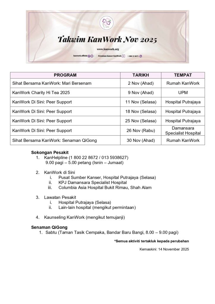 Sihat Bersama KanWork: Senaman QiGong 📅 30 November 2025 (Ahad)⏰️ 8.30 pagi🏡 Rumah KanWork, Damansara Utama. Fasilitator:Hjh Faridah Ahmad Aktiviti:1. Senaman QiGong2. Minum ringan3. Peer Support Jom Senam QiGong! Daftar: https://forms.gle/82kHYq6zNDpUkFqQA Tarikh tutup: 29 Nov 2025 (Sabtu, 2.00 ptg)